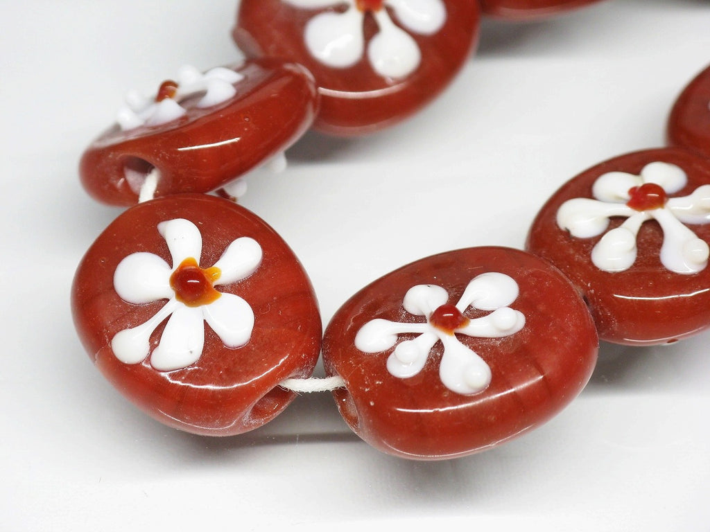 インドネシア・ジャワの工房で作られた丸形とんぼ玉のうち、「花」をモチーフとしたものは数多くあります。歴史が長いタイプのためほとんど無限と思われるほどさまざまなデザインがあり、また、そのことで同色同デザインの再現が難しいタイプです。数十年前にインドネシアで初めて見たこれらのとんぼ玉に魅せられて今この仕事をしているといっても過言ではありません。トコ・ビーズの最も古い商品の一つです。(この商品は手作りジュエリー・アクセサリーパーツ・エスニック雑貨として販売しています)