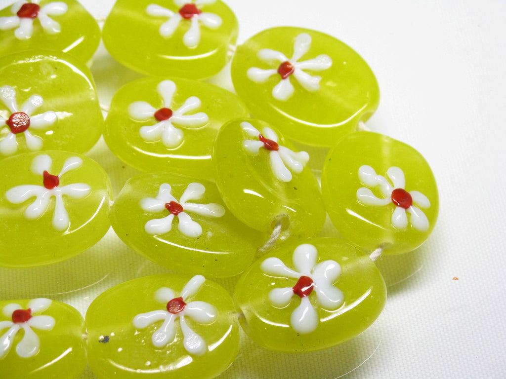 インドネシア・ジャワの工房で作られた丸形とんぼ玉のうち、「花」をモチーフとしたものは数多くあります。歴史が長いタイプのためほとんど無限と思われるほどさまざまなデザインがあり、また、そのことで同色同デザインの再現が難しいタイプです。数十年前にインドネシアで初めて見たこれらのとんぼ玉に魅せられて今この仕事をしているといっても過言ではありません。トコ・ビーズの最も古い商品の一つです。(この商品は手作りジュエリー・アクセサリーパーツ・エスニック雑貨として販売しています)