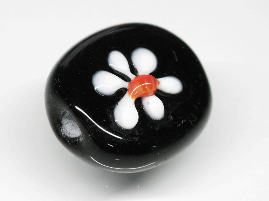 インドネシア・ジャワの工房で作られた丸形とんぼ玉のうち、「花」をモチーフとしたものは数多くあります。歴史が長いタイプのためほとんど無限と思われるほどさまざまなデザインがあり、また、そのことで同色同デザインの再現が難しいタイプです。数十年前にインドネシアで初めて見たこれらのとんぼ玉に魅せられて今この仕事をしているといっても過言ではありません。トコ・ビーズの最も古い商品の一つです。(この商品は手作りジュエリー・アクセサリーパーツ・エスニック雑貨として販売しています)
