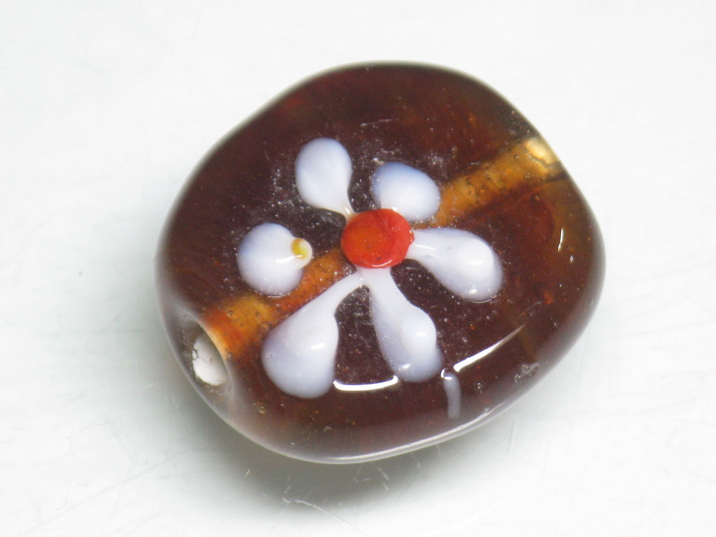 インドネシア・ジャワの工房で作られた丸形とんぼ玉のうち、「花」をモチーフとしたものは数多くあります。歴史が長いタイプのためほとんど無限と思われるほどさまざまなデザインがあり、また、そのことで同色同デザインの再現が難しいタイプです。数十年前にインドネシアで初めて見たこれらのとんぼ玉に魅せられて今この仕事をしているといっても過言ではありません。トコ・ビーズの最も古い商品の一つです。(この商品は手作りジュエリー・アクセサリーパーツ・エスニック雑貨として販売しています)