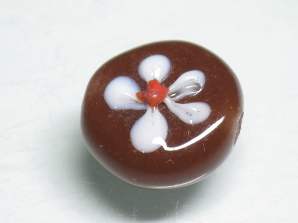 インドネシア・ジャワの工房で作られた丸形とんぼ玉のうち、「花」をモチーフとしたものは数多くあります。歴史が長いタイプのためほとんど無限と思われるほどさまざまなデザインがあり、また、そのことで同色同デザインの再現が難しいタイプです。数十年前にインドネシアで初めて見たこれらのとんぼ玉に魅せられて今この仕事をしているといっても過言ではありません。トコ・ビーズの最も古い商品の一つです。(この商品は手作りジュエリー・アクセサリーパーツ・エスニック雑貨として販売しています)