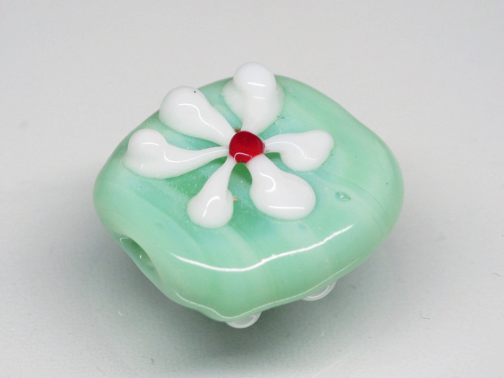 インドネシア・ジャワの工房で作られた丸形とんぼ玉のうち、「花」をモチーフとしたものは数多くあります。歴史が長いタイプのためほとんど無限と思われるほどさまざまなデザインがあり、また、そのことで同色同デザインの再現が難しいタイプです。数十年前にインドネシアで初めて見たこれらのとんぼ玉に魅せられて今この仕事をしているといっても過言ではありません。トコ・ビーズの最も古い商品の一つです。(この商品は手作りジュエリー・アクセサリーパーツ・エスニック雑貨として販売しています)