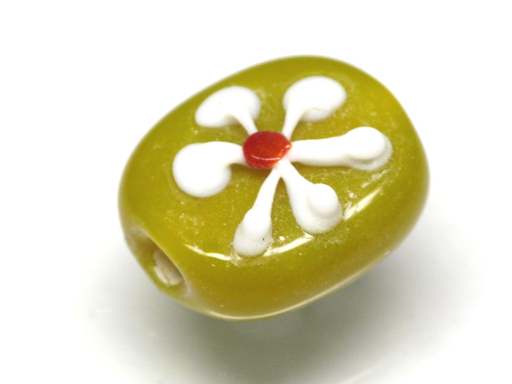 インドネシア・ジャワの工房で作られた丸形とんぼ玉のうち、「花」をモチーフとしたものは数多くあります。歴史が長いタイプのためほとんど無限と思われるほどさまざまなデザインがあり、また、そのことで同色同デザインの再現が難しいタイプです。数十年前にインドネシアで初めて見たこれらのとんぼ玉に魅せられて今この仕事をしているといっても過言ではありません。トコ・ビーズの最も古い商品の一つです。(この商品は手作りジュエリー・アクセサリーパーツ・エスニック雑貨として販売しています)