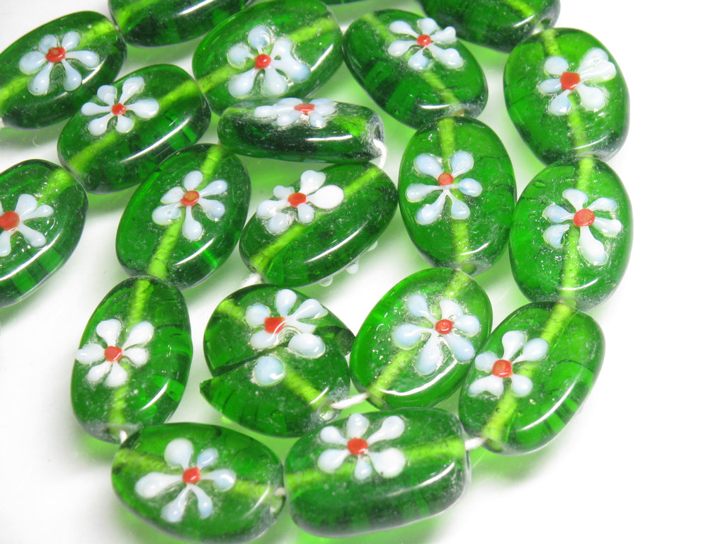 インドネシア・ジャワの工房で作られた丸形とんぼ玉のうち、「花」をモチーフとしたものは数多くあります。歴史が長いタイプのためほとんど無限と思われるほどさまざまなデザインがあり、また、そのことで同色同デザインの再現が難しいタイプです。数十年前にインドネシアで初めて見たこれらのとんぼ玉に魅せられて今この仕事をしているといっても過言ではありません。トコ・ビーズの最も古い商品の一つです。(この商品は手作りジュエリー・アクセサリーパーツ・エスニック雑貨として販売しています)