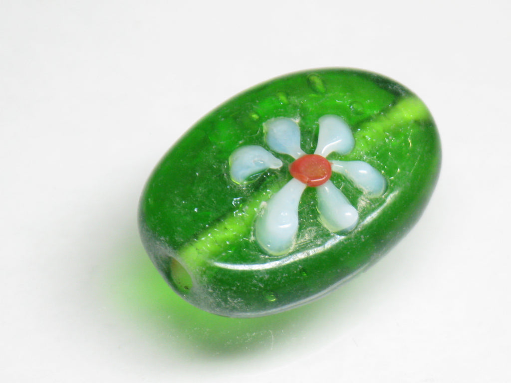 インドネシア・ジャワの工房で作られた丸形とんぼ玉のうち、「花」をモチーフとしたものは数多くあります。歴史が長いタイプのためほとんど無限と思われるほどさまざまなデザインがあり、また、そのことで同色同デザインの再現が難しいタイプです。数十年前にインドネシアで初めて見たこれらのとんぼ玉に魅せられて今この仕事をしているといっても過言ではありません。トコ・ビーズの最も古い商品の一つです。(この商品は手作りジュエリー・アクセサリーパーツ・エスニック雑貨として販売しています)