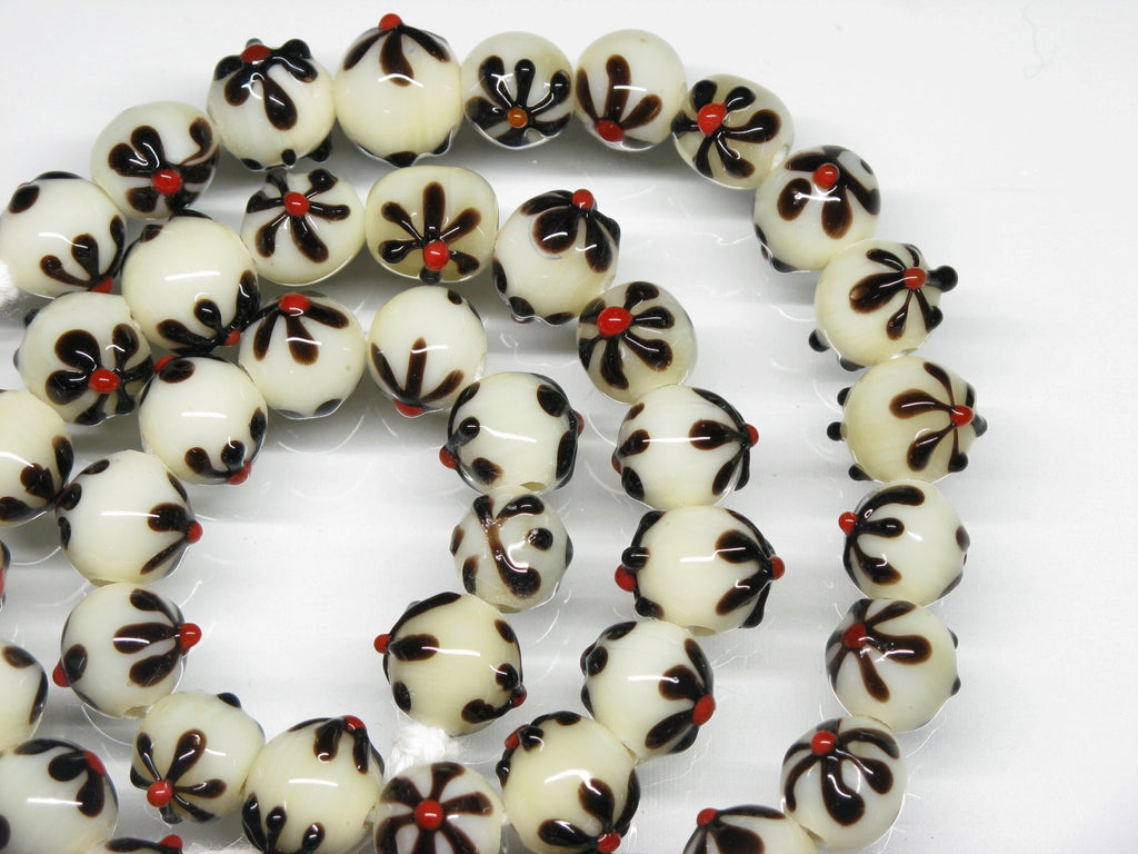 ジャワの丸形花柄ビーズ10㎜タイプです。従来品を少し小ぶりにしたため、ビーズのサイズと花柄のサイズのバランスが良くなりました。形状も真球に近くなりました。