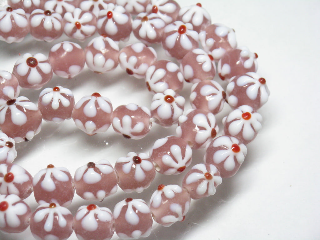 ジャワの丸形花柄ビーズ10㎜タイプです。従来品を少し小ぶりにしたため、ビーズのサイズと花柄のサイズのバランスが良くなりました。形状も真球に近くなりました。