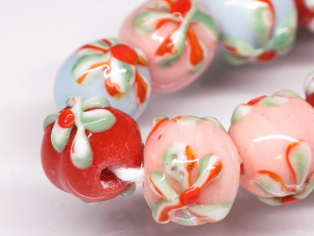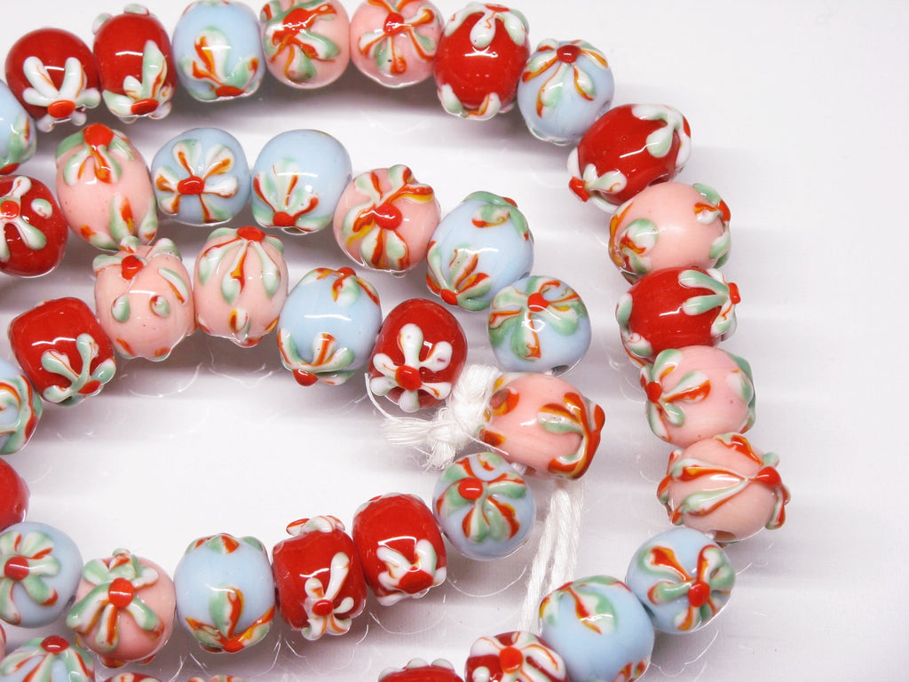 ジャワの丸形花柄ビーズ10㎜タイプです。従来品を少し小ぶりにしたため、ビーズのサイズと花柄のサイズのバランスが良くなりました。形状も真球に近くなりました。
