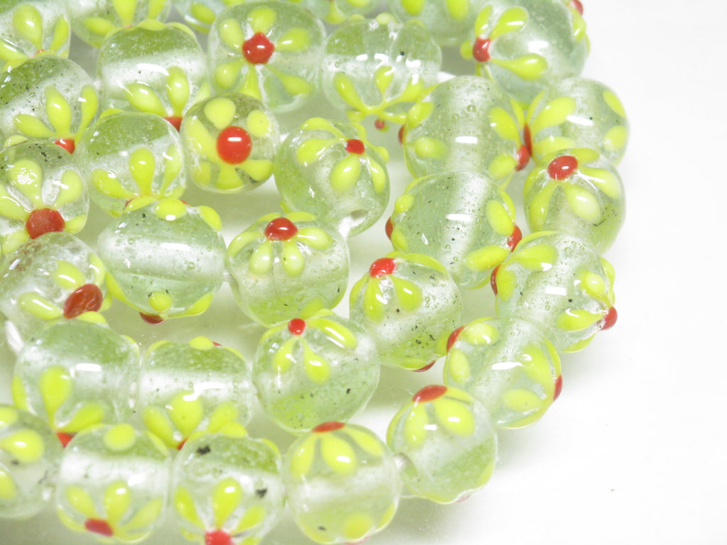 ジャワの丸形花柄ビーズ10㎜タイプです。従来品を少し小ぶりにしたため、ビーズのサイズと花柄のサイズのバランスが良くなりました。形状も真球に近くなりました。