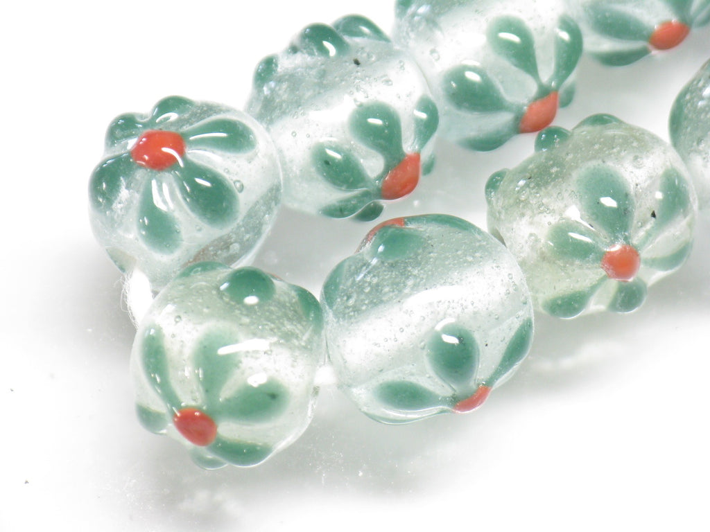 ジャワの丸形花柄ビーズ10㎜タイプです。従来品を少し小ぶりにしたため、ビーズのサイズと花柄のサイズのバランスが良くなりました。形状も真球に近くなりました。