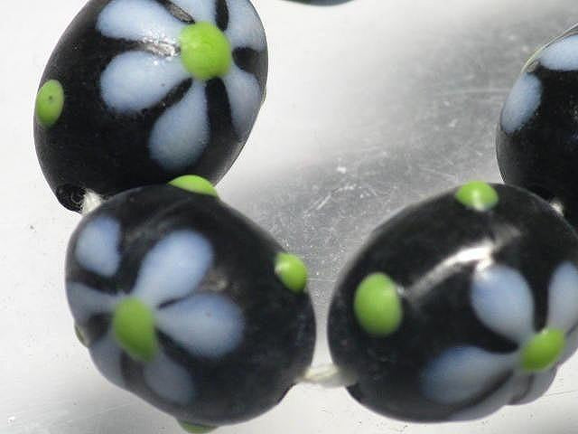 インドネシア・ジャワの工房で作られた丸形とんぼ玉のうち、「花」をモチーフとしたものは数多くあります。歴史が長いタイプのためほとんど無限と思われるほどさまざまなデザインがあり、また、そのことで同色同デザインの再現が難しいタイプです。数十年前にインドネシアで初めて見たこれらのとんぼ玉に魅せられて今この仕事をしているといっても過言ではありません。トコ・ビーズの最も古い商品の一つです。(この商品は手作りジュエリー・アクセサリーパーツ・エスニック雑貨として販売しています)