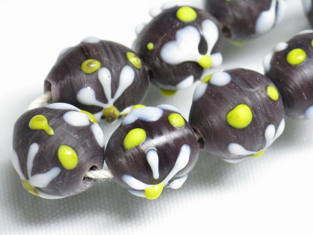 インドネシア・ジャワの工房で作られた丸形とんぼ玉のうち、「花」をモチーフとしたものは数多くあります。歴史が長いタイプのためほとんど無限と思われるほどさまざまなデザインがあり、また、そのことで同色同デザインの再現が難しいタイプです。数十年前にインドネシアで初めて見たこれらのとんぼ玉に魅せられて今この仕事をしているといっても過言ではありません。トコ・ビーズの最も古い商品の一つです。(この商品は手作りジュエリー・アクセサリーパーツ・エスニック雑貨として販売しています)