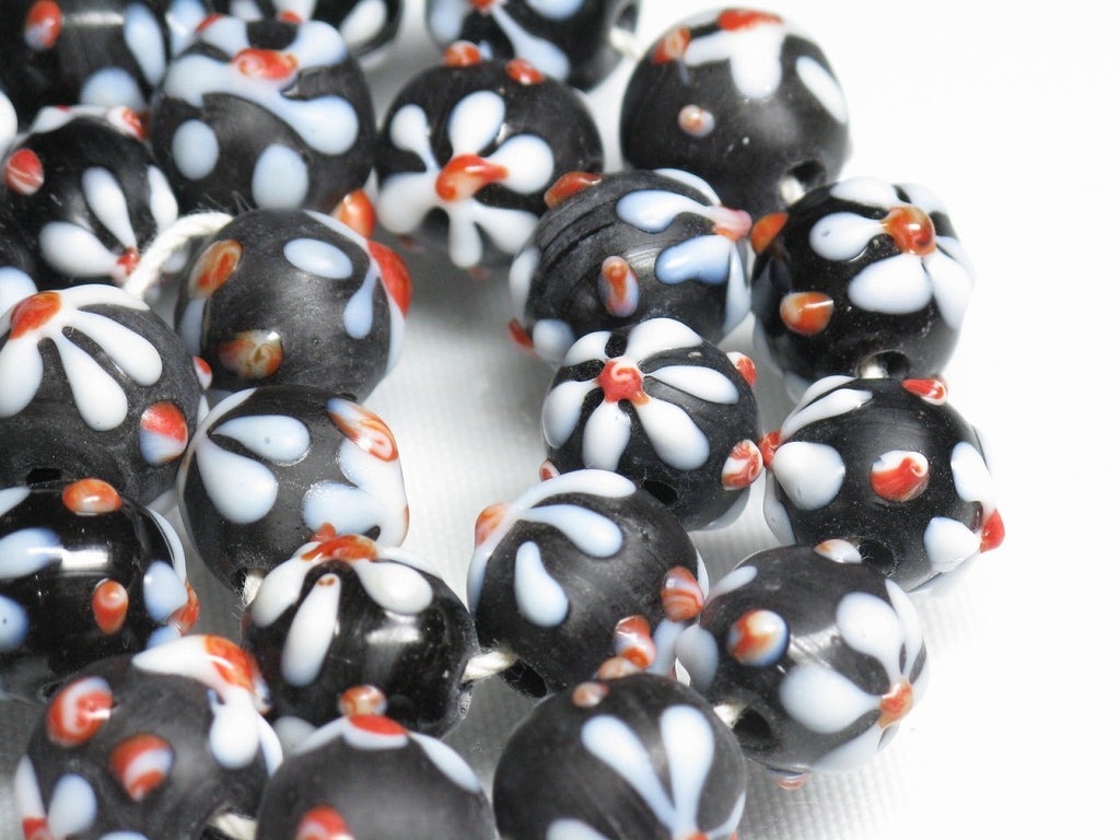 インドネシア・ジャワの工房で作られた丸形とんぼ玉のうち、「花」をモチーフとしたものは数多くあります。歴史が長いタイプのためほとんど無限と思われるほどさまざまなデザインがあり、また、そのことで同色同デザインの再現が難しいタイプです。数十年前にインドネシアで初めて見たこれらのとんぼ玉に魅せられて今この仕事をしているといっても過言ではありません。トコ・ビーズの最も古い商品の一つです。(この商品は手作りジュエリー・アクセサリーパーツ・エスニック雑貨として販売しています)