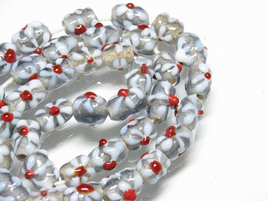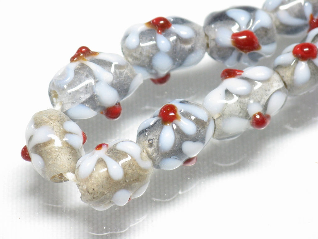 インドネシア・ジャワの工房で作られた丸形とんぼ玉のうち、「花」をモチーフとしたものは数多くあります。歴史が長いタイプのためほとんど無限と思われるほどさまざまなデザインがあり、また、そのことで同色同デザインの再現が難しいタイプです。数十年前にインドネシアで初めて見たこれらのとんぼ玉に魅せられて今この仕事をしているといっても過言ではありません。トコ・ビーズの最も古い商品の一つです。(この商品は手作りジュエリー・アクセサリーパーツ・エスニック雑貨として販売しています)