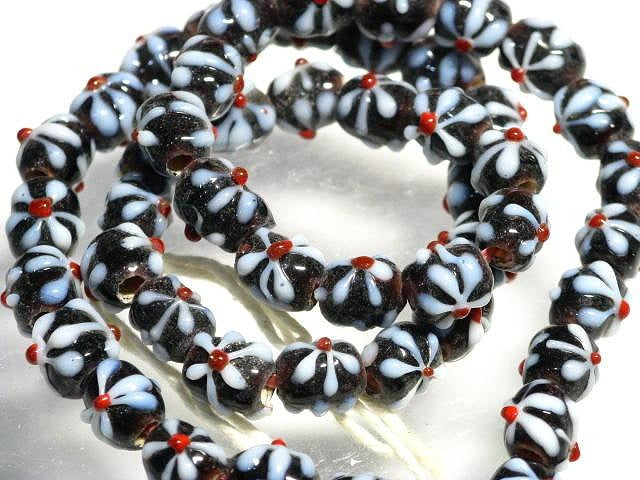 インドネシア・ジャワの工房で作られた丸形とんぼ玉のうち、「花」をモチーフとしたものは数多くあります。歴史が長いタイプのためほとんど無限と思われるほどさまざまなデザインがあり、また、そのことで同色同デザインの再現が難しいタイプです。数十年前にインドネシアで初めて見たこれらのとんぼ玉に魅せられて今この仕事をしているといっても過言ではありません。トコ・ビーズの最も古い商品の一つです。(この商品は手作りジュエリー・アクセサリーパーツ・エスニック雑貨として販売しています)