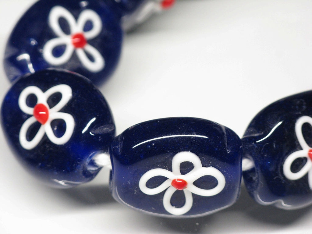 インドネシア・ジャワの工房で作られた丸形とんぼ玉のうち、「花」をモチーフとしたものは数多くあります。歴史が長いタイプのためほとんど無限と思われるほどさまざまなデザインがあり、また、そのことで同色同デザインの再現が難しいタイプです。数十年前にインドネシアで初めて見たこれらのとんぼ玉に魅せられて今この仕事をしているといっても過言ではありません。トコ・ビーズの最も古い商品の一つです。(この商品は手作りジュエリー・アクセサリーパーツ・エスニック雑貨として販売しています)