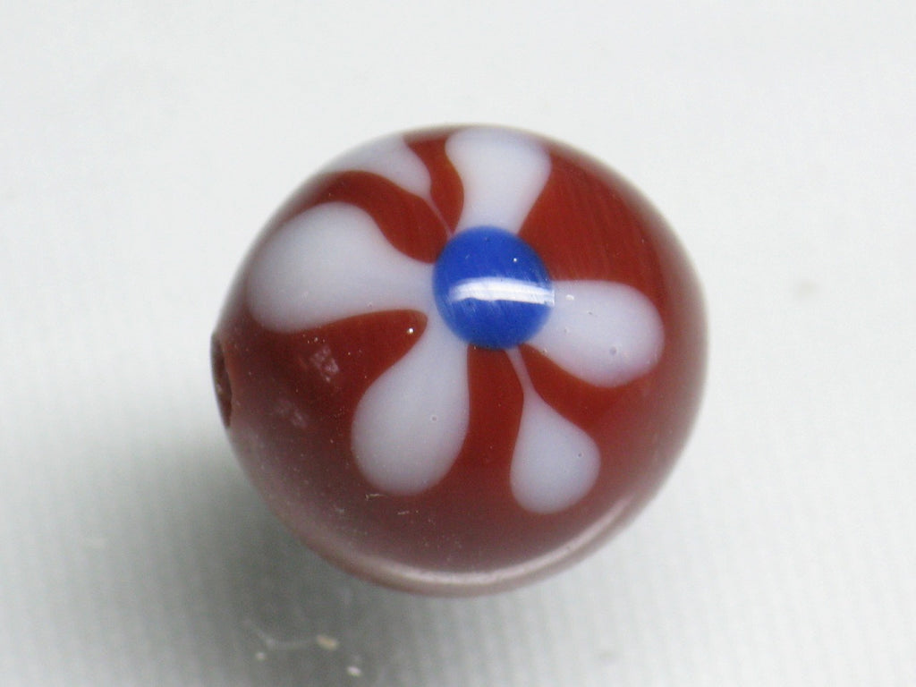 インドネシア・ジャワの工房で作られた丸形とんぼ玉のうち、「花」をモチーフとしたものは数多くあります。歴史が長いタイプのためほとんど無限と思われるほどさまざまなデザインがあり、また、そのことで同色同デザインの再現が難しいタイプです。数十年前にインドネシアで初めて見たこれらのとんぼ玉に魅せられて今この仕事をしているといっても過言ではありません。トコ・ビーズの最も古い商品の一つです。(この商品は手作りジュエリー・アクセサリーパーツ・エスニック雑貨として販売しています)