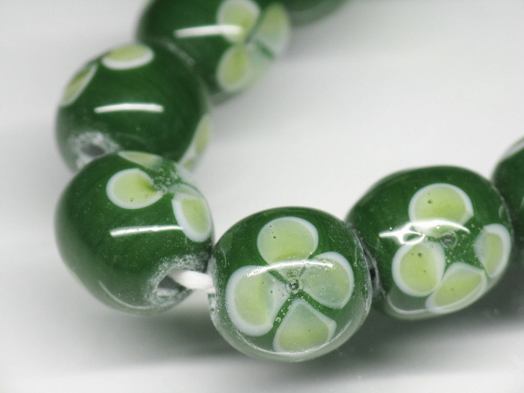 インドネシア・ジャワの工房で作られた丸形とんぼ玉のうち、「花」をモチーフとしたものは数多くあります。歴史が長いタイプのためほとんど無限と思われるほどさまざまなデザインがあり、また、そのことで同色同デザインの再現が難しいタイプです。数十年前にインドネシアで初めて見たこれらのとんぼ玉に魅せられて今この仕事をしているといっても過言ではありません。トコ・ビーズの最も古い商品の一つです。(この商品は手作りジュエリー・アクセサリーパーツ・エスニック雑貨として販売しています)