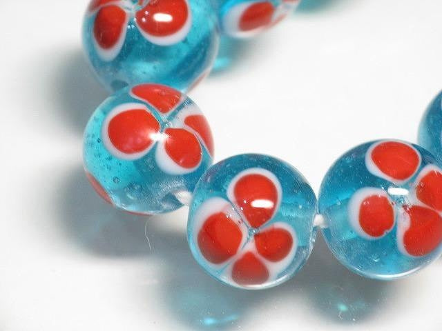 インドネシア・ジャワの工房で作られた丸形とんぼ玉のうち、「花」をモチーフとしたものは数多くあります。歴史が長いタイプのためほとんど無限と思われるほどさまざまなデザインがあり、また、そのことで同色同デザインの再現が難しいタイプです。数十年前にインドネシアで初めて見たこれらのとんぼ玉に魅せられて今この仕事をしているといっても過言ではありません。トコ・ビーズの最も古い商品の一つです。(この商品は手作りジュエリー・アクセサリーパーツ・エスニック雑貨として販売しています)