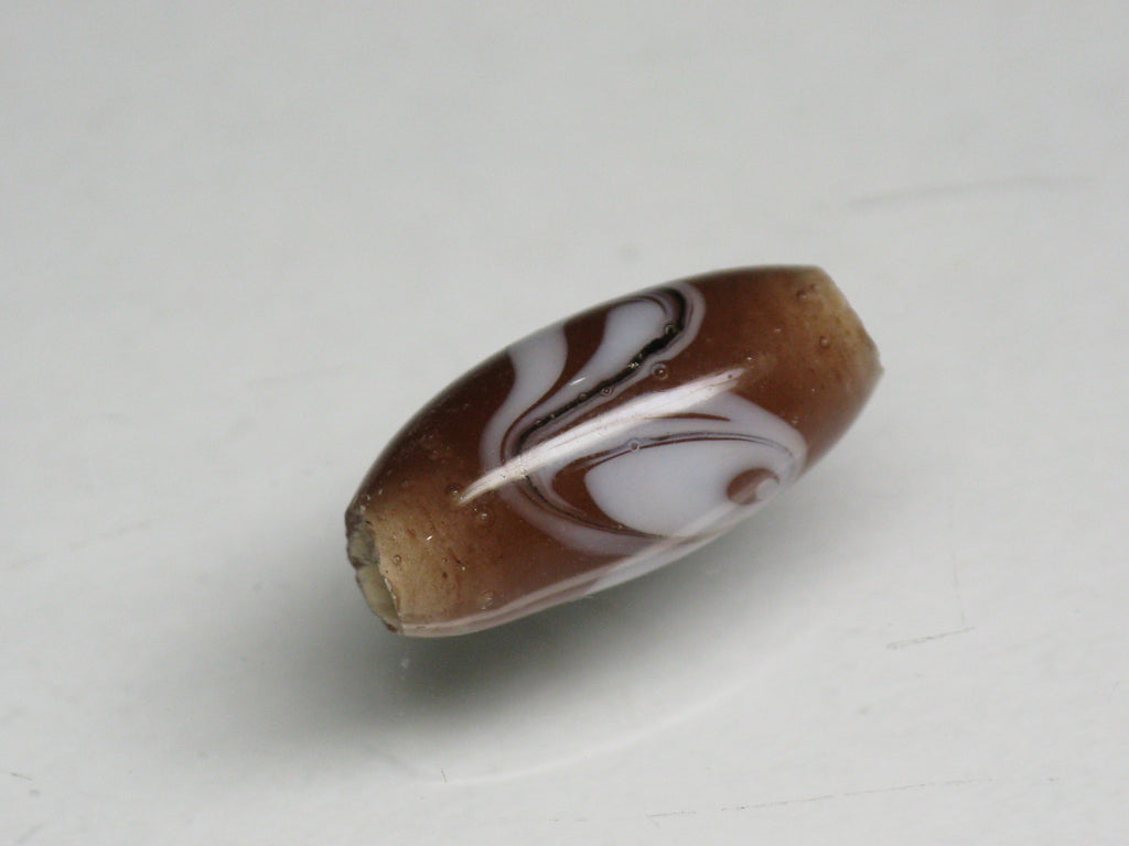 表面に花柄の模様を描いたバレル型のガラスビーズです。型を使わずに一粒づつ手作業で溶かしたガラスを使って描いていますのですべての模様が個性的です。