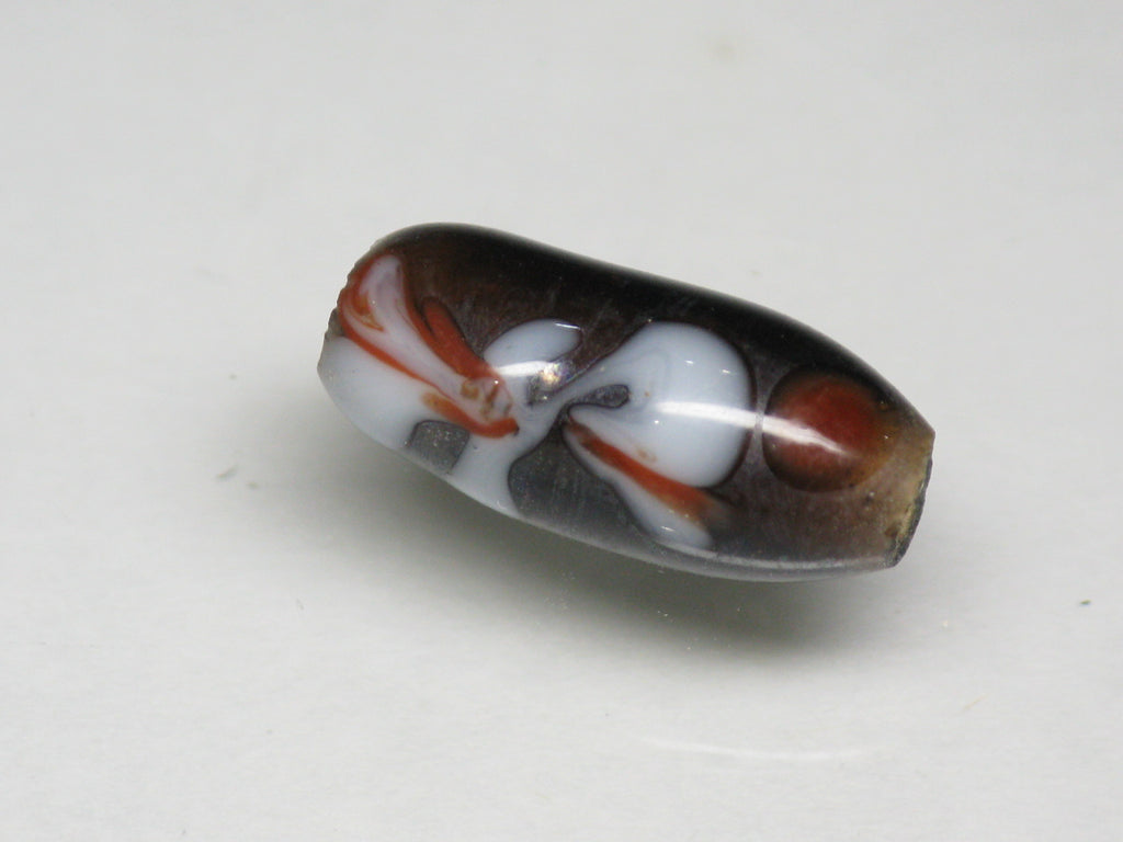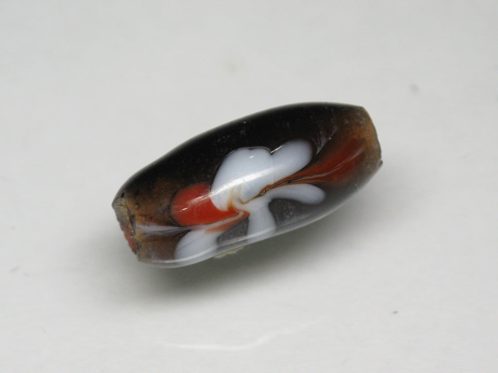 表面に花柄の模様を描いたバレル型のガラスビーズです。型を使わずに一粒づつ手作業で溶かしたガラスを使って描いていますのですべての模様が個性的です。