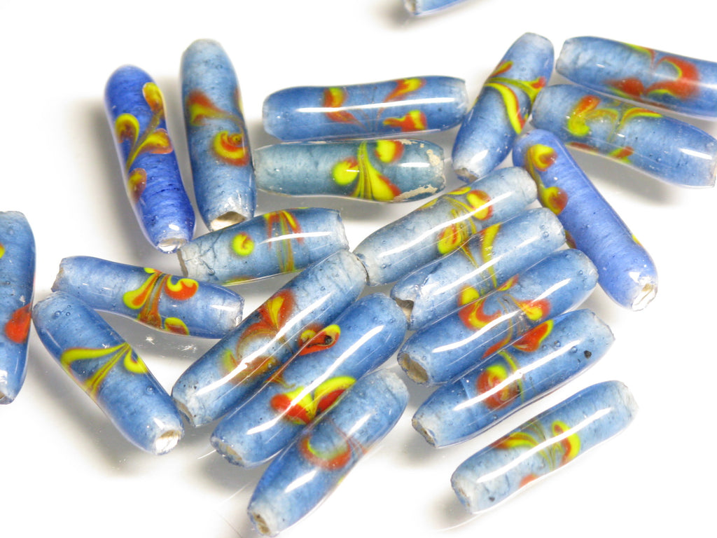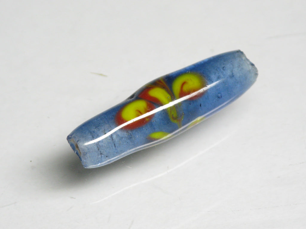 表面に花柄の模様を描いたバレル型のガラスビーズです。型を使わずに一粒づつ手作業で溶かしたガラスを使って描いていますのですべての模様が個性的です。