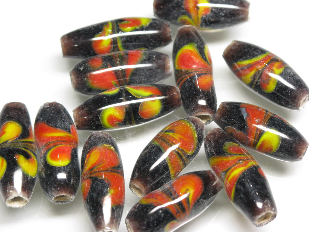 表面に花柄の模様を描いたバレル型のガラスビーズです。型を使わずに一粒づつ手作業で溶かしたガラスを使って描いていますのですべての模様が個性的です。