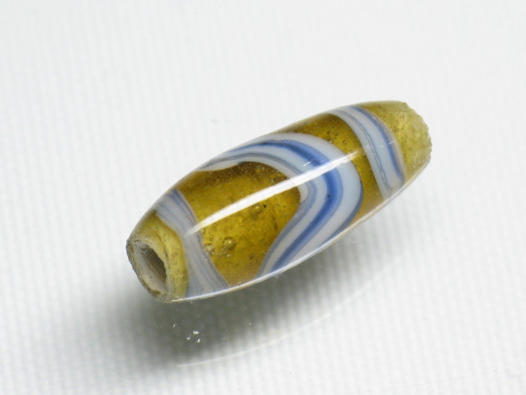 ジャワのランプワークガラスビーズ。両端にカラーベルトを配したデザインで、太鼓の形に似ていることから「太鼓型」と呼んでいます。