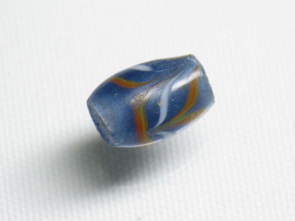 矢羽根文様のランプワークガラスビーズです。作成過程の最終工程で横縞模様に対して上から下、下から上と交互に金属ロッドで引っ掻いて付けらた模様です。