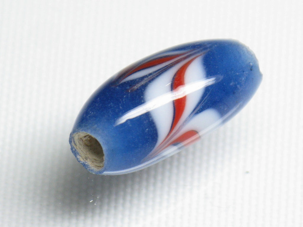 矢羽根文様のランプワークガラスビーズです。作成過程の最終工程で横縞模様に対して上から下、下から上と交互に金属ロッドで引っ掻いて付けらた模様です。