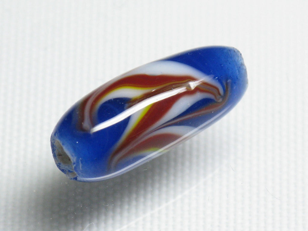 矢羽根文様のランプワークガラスビーズです。作成過程の最終工程で横縞模様に対して上から下、下から上と交互に金属ロッドで引っ掻いて付けらた模様です。