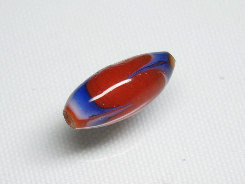 矢羽根文様のランプワークガラスビーズです。作成過程の最終工程で横縞模様に対して上から下、下から上と交互に金属ロッドで引っ掻いて付けらた模様です。