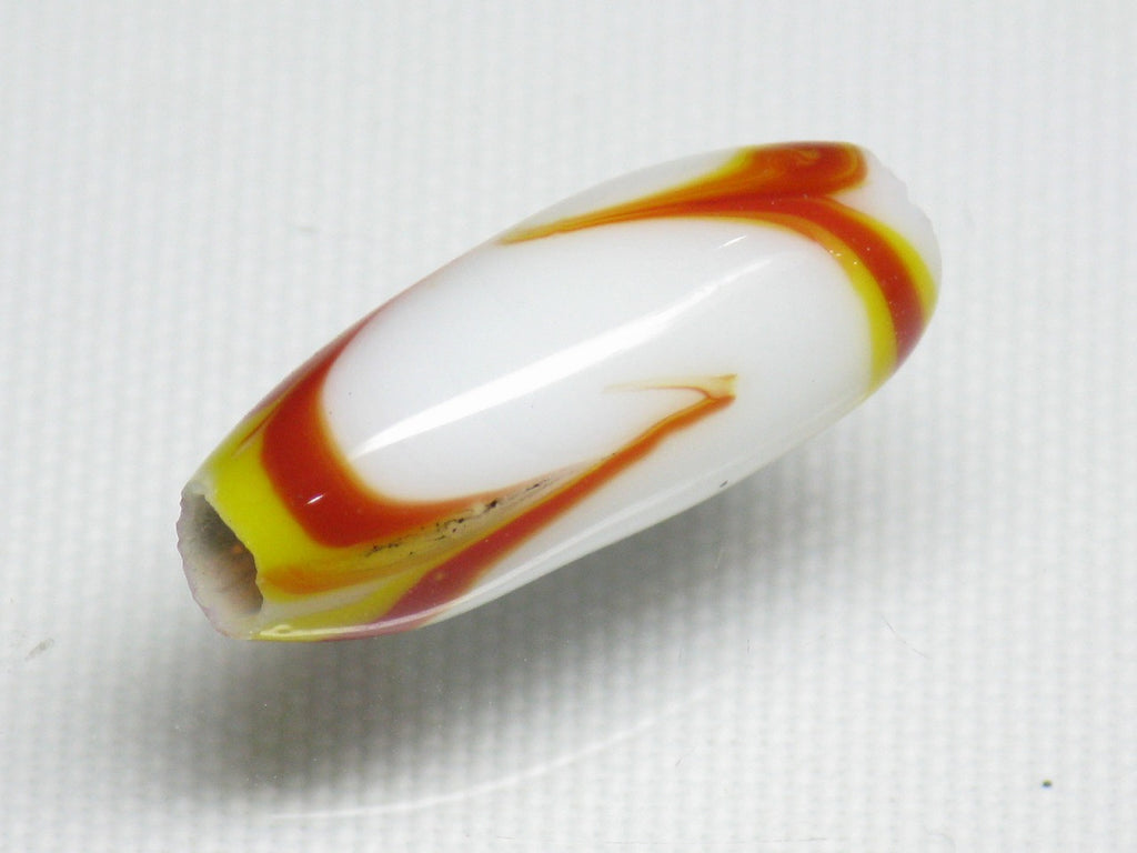 矢羽根文様のランプワークガラスビーズです。作成過程の最終工程で横縞模様に対して上から下、下から上と交互に金属ロッドで引っ掻いて付けらた模様です。