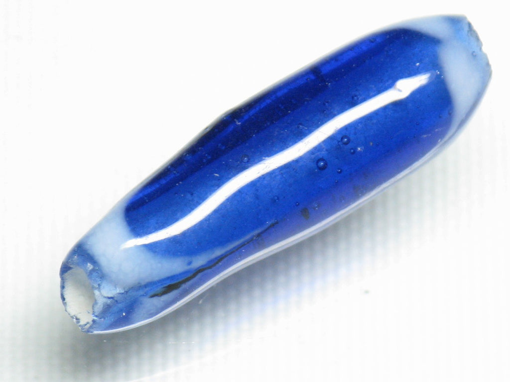 矢羽根文様のランプワークガラスビーズです。作成過程の最終工程で横縞模様に対して上から下、下から上と交互に金属ロッドで引っ掻いて付けらた模様です。