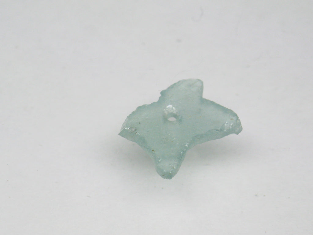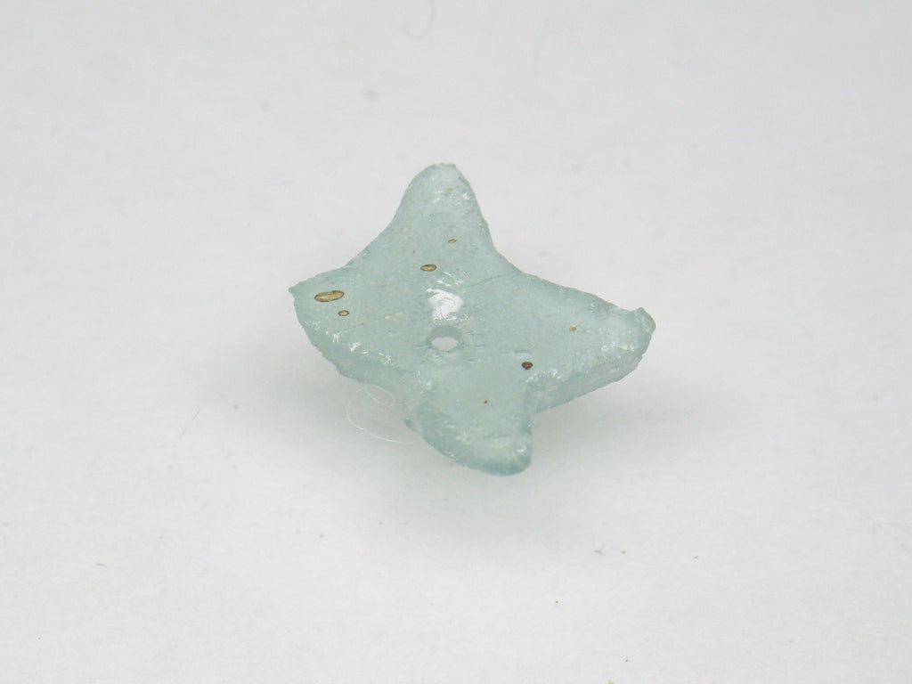 出土した薄い板状のガラス片を蝶のような形状にカットして中央に穴を開けたアフガニスタン産のローマングラスビーズです。アフガニスタンはローマ時代にはシルクロードの要衝であったため、長い間土中に埋もれていた当時のガラス製品の破片が大量に出土します。