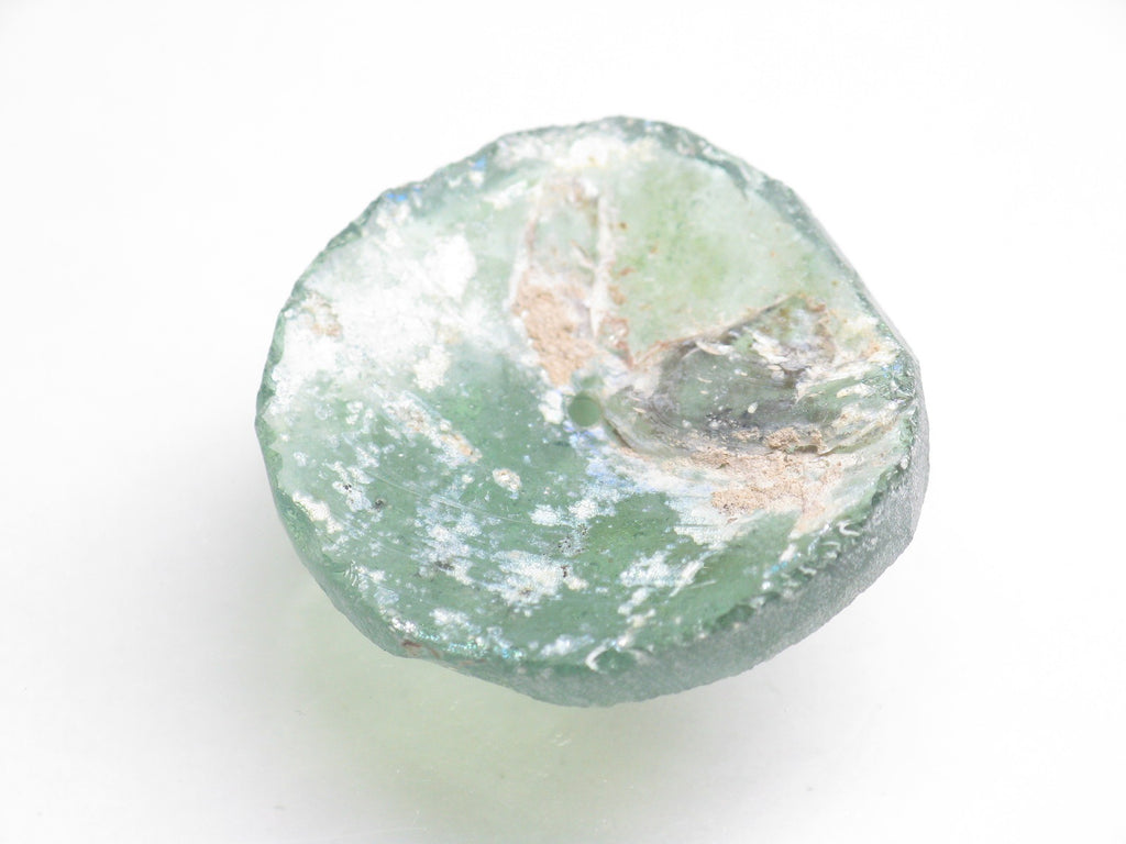 アフガニスタン産のローマングラスビーズの薄い破片を円盤状に加工・整形して中心に穴を開けたパーツ。長い間土中に埋もれて銀化したガラス表面が美しい光を放ちます。弊店のローマングラスはアフガニスタン北部一帯やバーミヤン近郊で出土したものです。アフガニスタンはローマ時代にはシルクロードの要衝であったため、長い間土中に埋もれていた当時のガラス製品の破片が大量に出土します。