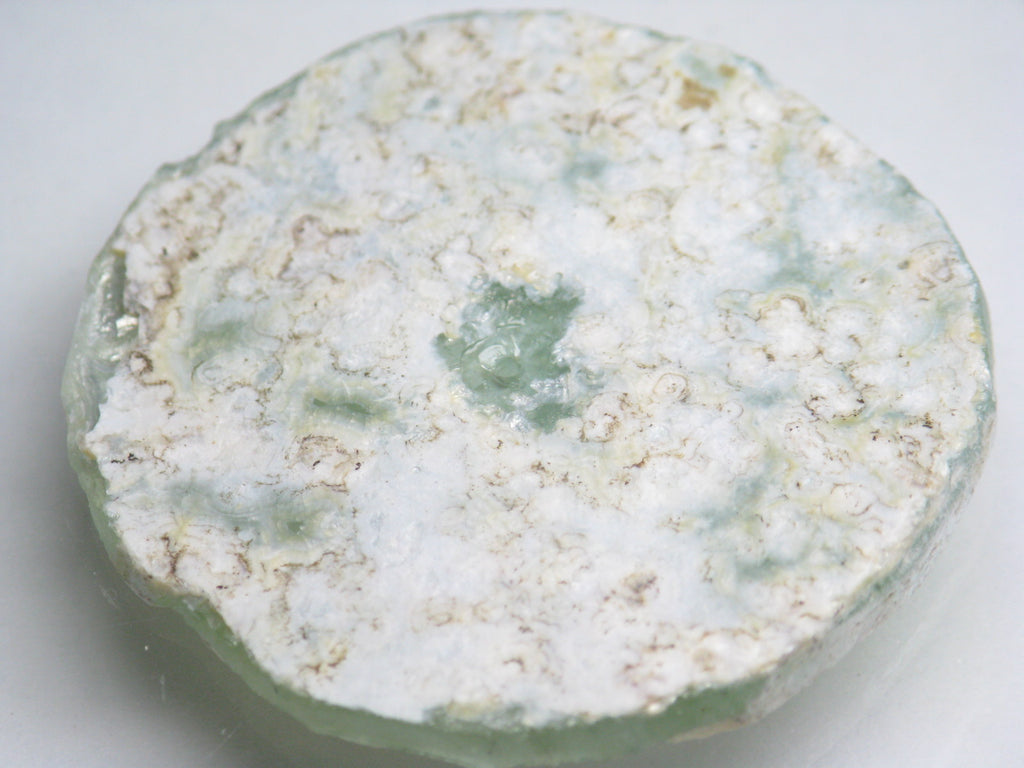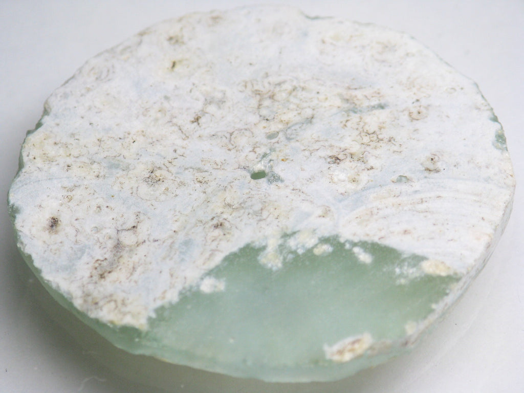 アフガニスタン産のローマングラスビーズの薄い破片を円盤状に加工・整形して中心に穴を開けたパーツ。長い間土中に埋もれて銀化したガラス表面が美しい光を放ちます。弊店のローマングラスはアフガニスタン北部一帯やバーミヤン近郊で出土したものです。アフガニスタンはローマ時代にはシルクロードの要衝であったため、長い間土中に埋もれていた当時のガラス製品の破片が大量に出土します。