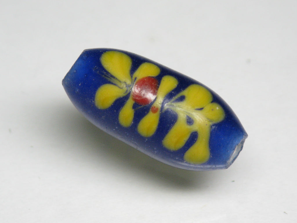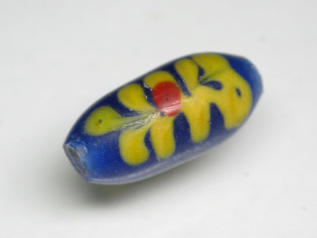 表面に花柄の模様を描いたバレル型のガラスビーズです。型を使わずに一粒づつ手作業で溶かしたガラスを使って描いていますのですべての模様が個性的です。