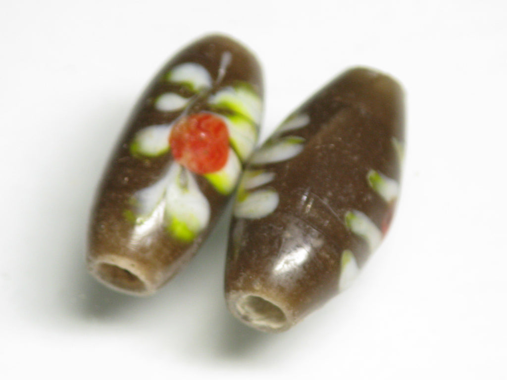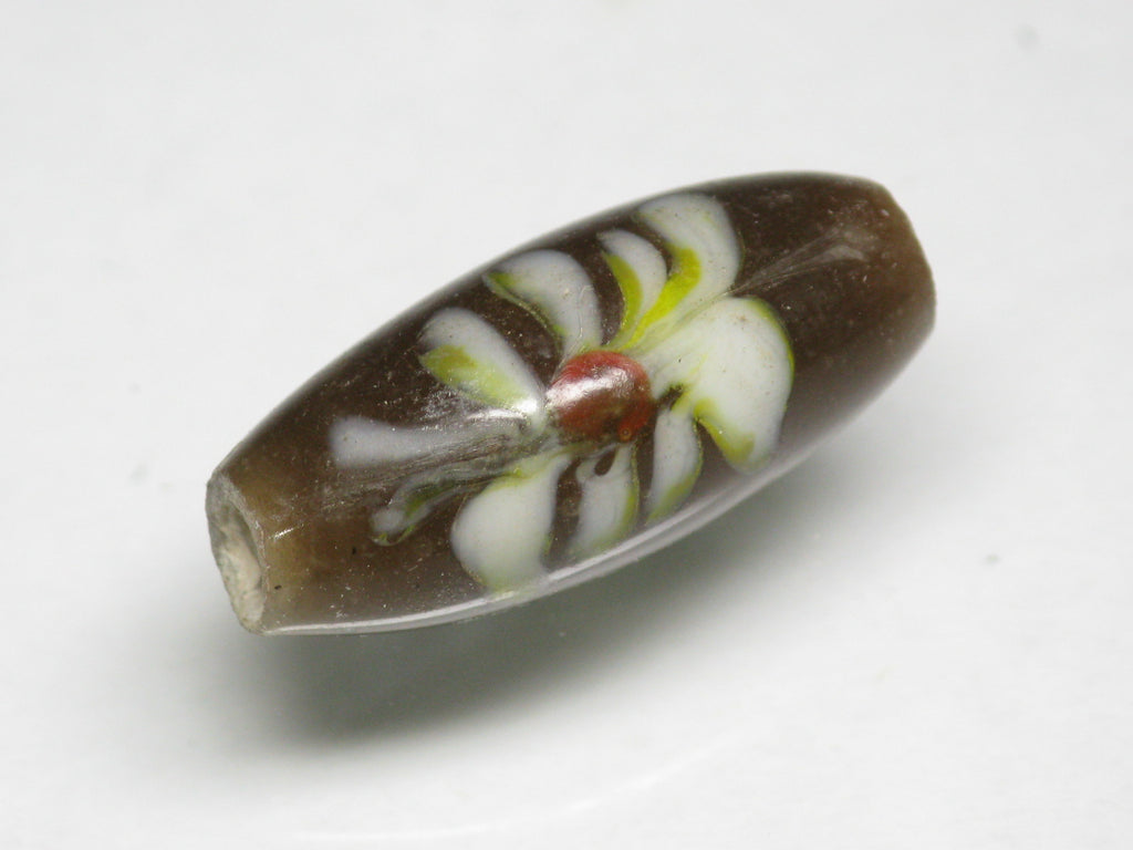 表面に花柄の模様を描いたバレル型のガラスビーズです。型を使わずに一粒づつ手作業で溶かしたガラスを使って描いていますのですべての模様が個性的です。