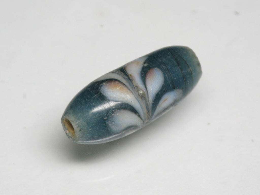 表面に花柄の模様を描いたバレル型のガラスビーズです。型を使わずに一粒づつ手作業で溶かしたガラスを使って描いていますのですべての模様が個性的です。