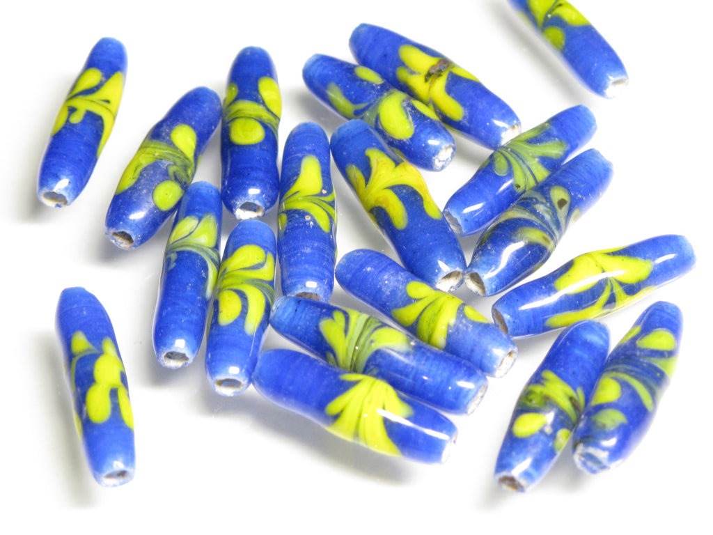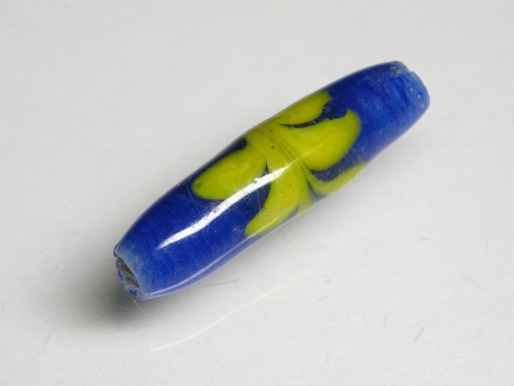 表面に花柄の模様を描いたバレル型のガラスビーズです。型を使わずに一粒づつ手作業で溶かしたガラスを使って描いていますのですべての模様が個性的です。