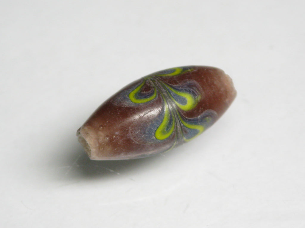 表面に花柄の模様を描いたバレル型のガラスビーズです。型を使わずに一粒づつ手作業で溶かしたガラスを使って描いていますのですべての模様が個性的です。