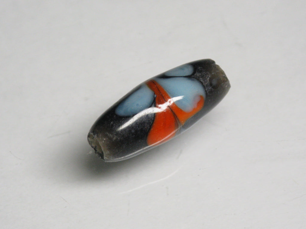 表面に花柄の模様を描いたバレル型のガラスビーズです。型を使わずに一粒づつ手作業で溶かしたガラスを使って描いていますのですべての模様が個性的です。