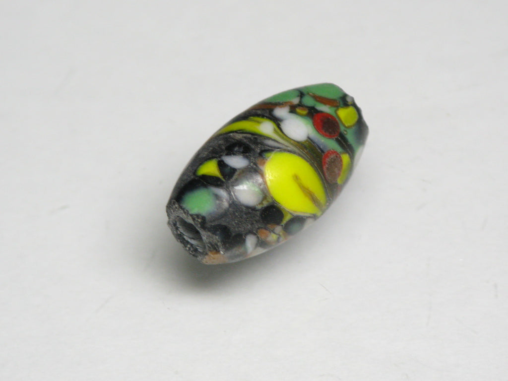 夜空に開く花火のような花柄の模様を描いたバレル型のガラスビーズです。型を使わずに一粒づつ手作業で溶かしたガラスを使って描いていますのですべての模様が個性的です。