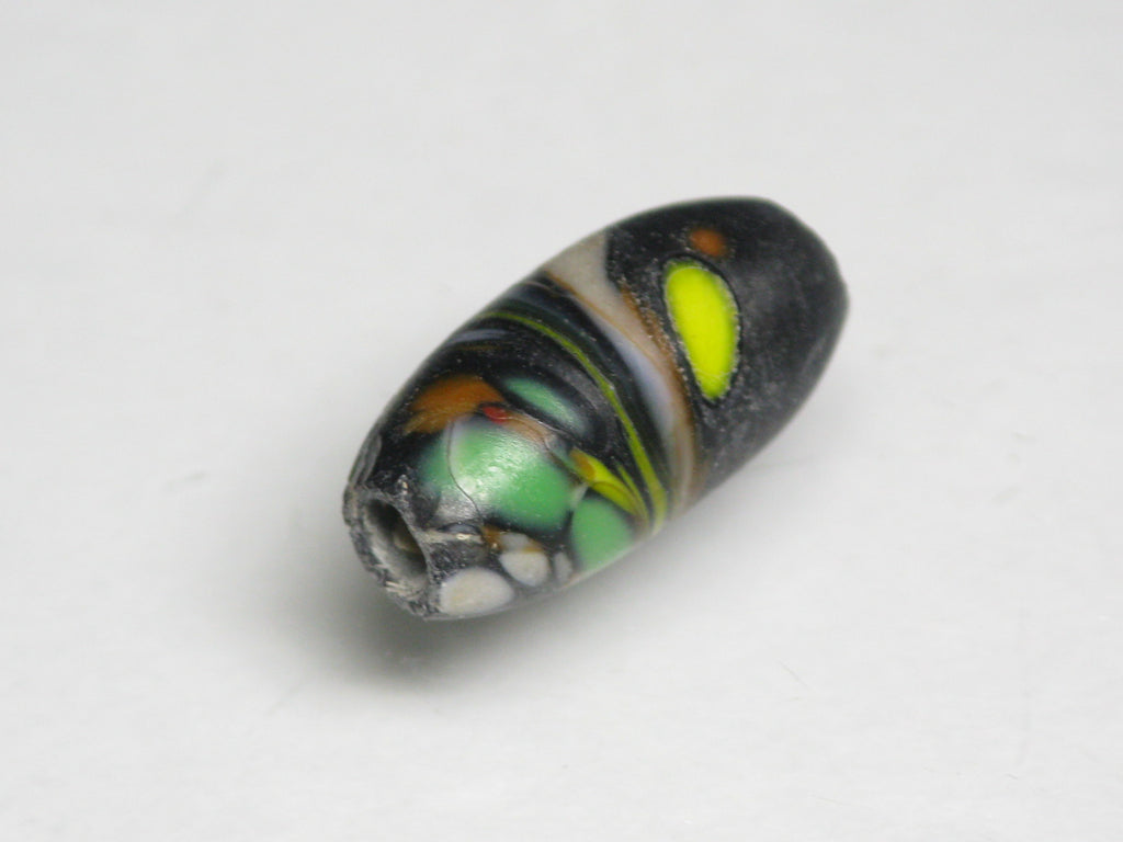 夜空に開く花火のような花柄の模様を描いたバレル型のガラスビーズです。型を使わずに一粒づつ手作業で溶かしたガラスを使って描いていますのですべての模様が個性的です。