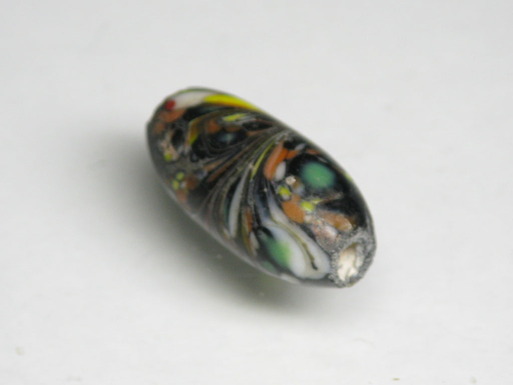 夜空に開く花火のような花柄の模様を描いたバレル型のガラスビーズです。型を使わずに一粒づつ手作業で溶かしたガラスを使って描いていますのですべての模様が個性的です。