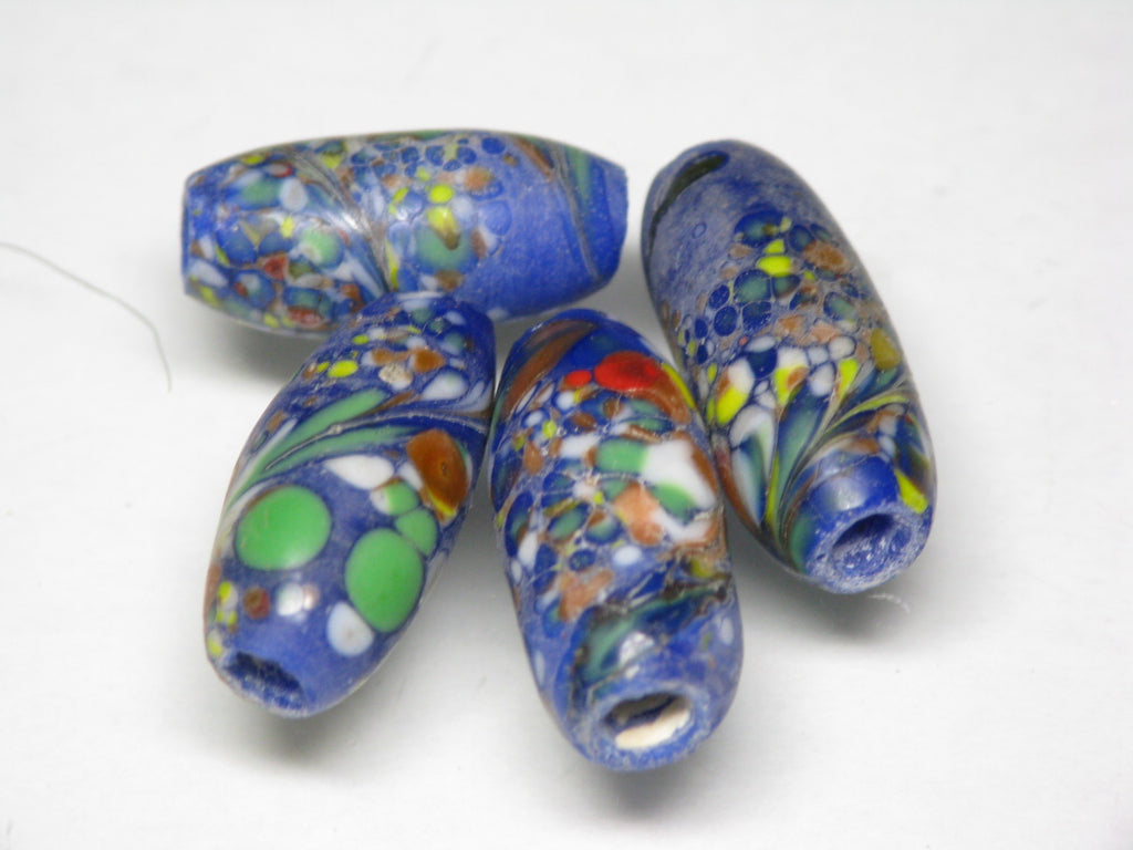 夜空に開く花火のような花柄の模様を描いたバレル型のガラスビーズです。型を使わずに一粒づつ手作業で溶かしたガラスを使って描いていますのですべての模様が個性的です。
