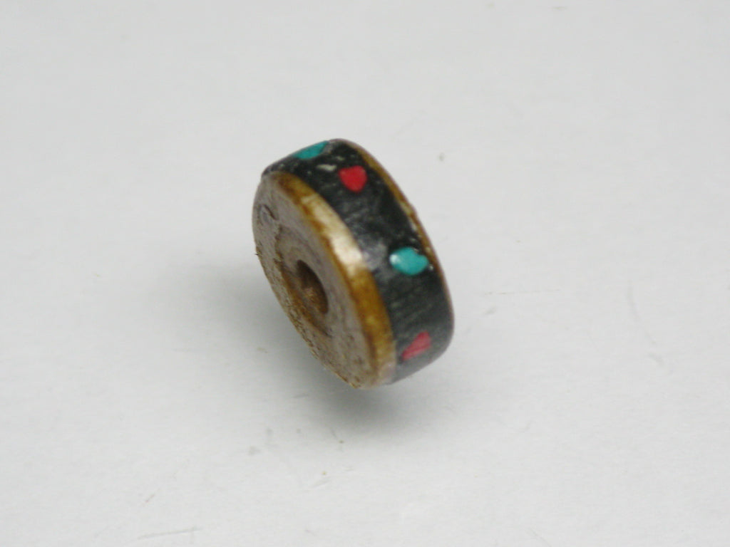 Tibetan bone beads made of yak bone with stones and brass embedded in the sides. They are used in Tibet for beads.