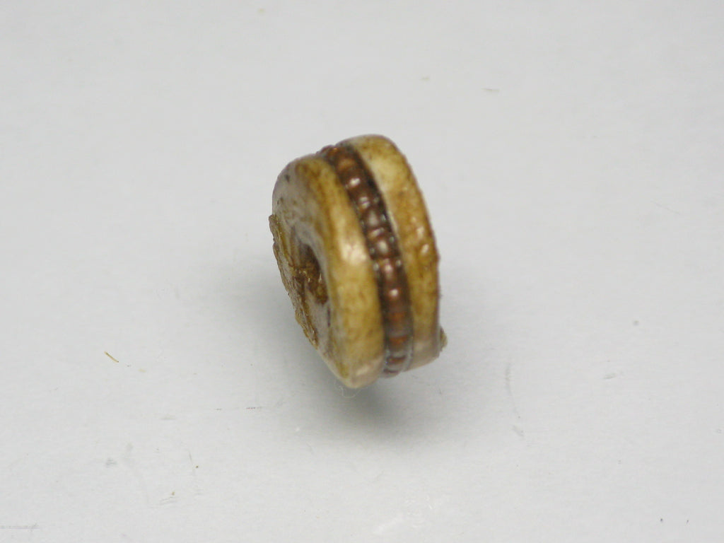 Tibetan bone beads made of yak bone with stones and brass embedded in the sides. They are used in Tibet for beads.