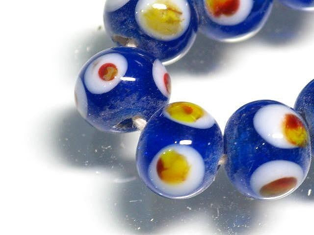 A traditional round lampwork bead with a combination of relatively small spots and stripes made in a workshop in Java, Indonesia. Since it has a long history, there are so many different designs that it seems almost infinite, and it is difficult to reproduce the same color and design. It is no exaggeration to say that I am doing this job now because I was fascinated by these lampwork bead that I saw for the first time in Indonesia decades ago.